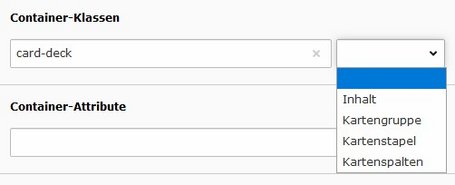 Wenn Karten in einem Container aufgenommen werden, so erscheinen diese in einer Reihe und mit gleicher Höhe. Dazu sollte dem Feld "Container-Klasses" des Containers eine Kartenklasse zugewiesen werden.