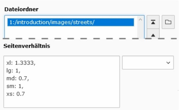 Um mehere Bilder mit dem selben Seitenverhältnis auszugeben, kann dieses über ein separates Feld definiert werden. Dies ist speziell bei der Ausgabe von Bildern eines Ordners nützlich, wenn die enthaltenen Bilder verschiedene Seitenverhältnisse aufweisen.